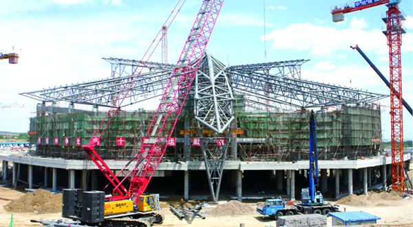 濱海體育中心建設(shè)是錦州全市人民的矚目工程,是向省政府承諾承辦2013年第十二屆全國(guó)體育運(yùn)動(dòng)會(huì)羽毛球比賽的重點(diǎn)工程。工程結(jié)構(gòu)形式較為特殊,鋼結(jié)構(gòu)總量4800多噸,施工過(guò)程中存在多個(gè)專業(yè)的交叉施工,受到場(chǎng)地條件、垂直運(yùn)輸?shù)闹萍s,對(duì)整個(gè)工程的安全管理要求很高。工程有幾個(gè)特點(diǎn),一是體量比較大,體育場(chǎng)建筑面積有62300平方米,二是工程復(fù)雜,屋面的網(wǎng)架大跨度253米,拱高75米,在我國(guó)也是個(gè)比較大的體育場(chǎng)工程,另外拱腳比較大,每個(gè)拱腳的土方量在1萬(wàn)立方米。